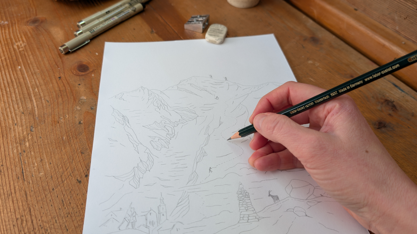 Gorbea’s founder skied and ran these mountains many times. Artist Katarina Nord drew this in the Alps themselves. As a frequent skier and climber in Chamonix, she knows these ridges—the way light cuts across glaciers, the rhythm of ascent. Every line was born from that intimacy.